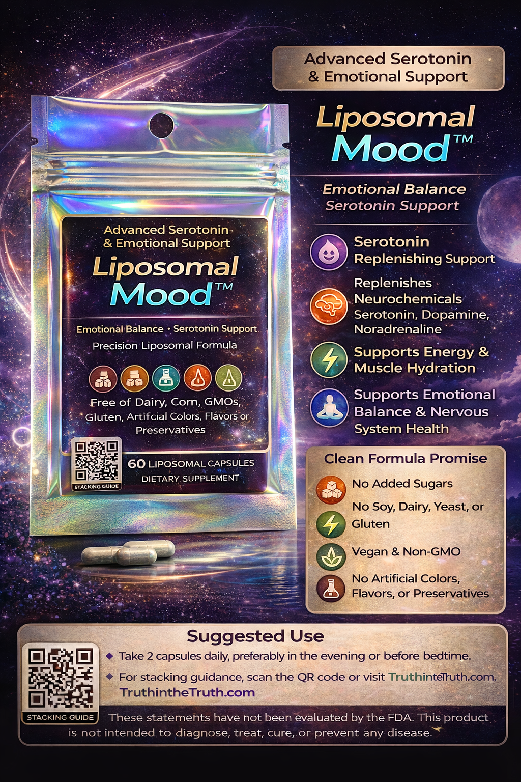 This product is not intended to diagnose, treat, cure, or prevent any disease and should not be taken without approval from a medical professional if you suspect or have been diagnosed with a medical condition or if you are are taking any prescription medication for any medical conditions. It is the customer’s responsibility to read the ingredients list to and know if you are allergic to any ingredients such as Sunflower Lecithin which is used in the process of Liposomal Absorption in our Products. Truth in the Truth is not responsible for any damages caused by misuse of product. Customer assumes all responsibility by taking this product and must be a Healthy adult in order to use this product. Keep out of reach of children.